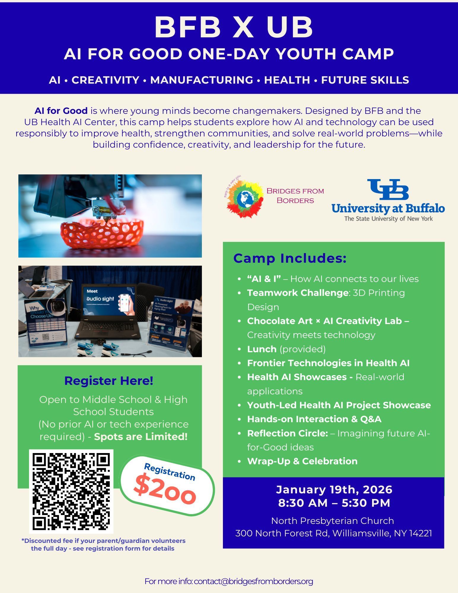 AI for Good Youth Camp is a new youth-centered learning initiative co-created by Bridges from Borders (BFB) and the University at Buffalo Health AI Center. This immersive camp marks the beginning of an ongoing AI for Good journey—combining workshops and hands-on learning experiences for middle and high school students.